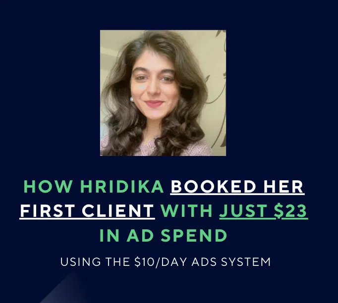 Hridika is a course creation and launch marketing expert based in India. She was tired of relying on referrals and FB groups to find clients — so she started using the $10/Day Ads System to build her own lead engine.