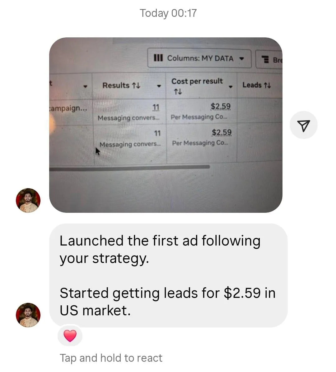 "Used your strategy in my clients' account - this is the lowest CPL we've ever had for leads from the US"